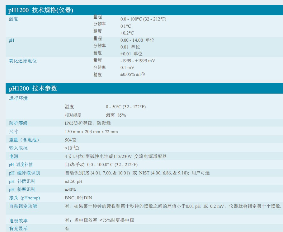 pH、氧化還原電位、溫度。pH1200可提供以YSI品質的pH或氧化還原電位的實驗室測量。圖為儀器和170電很座。